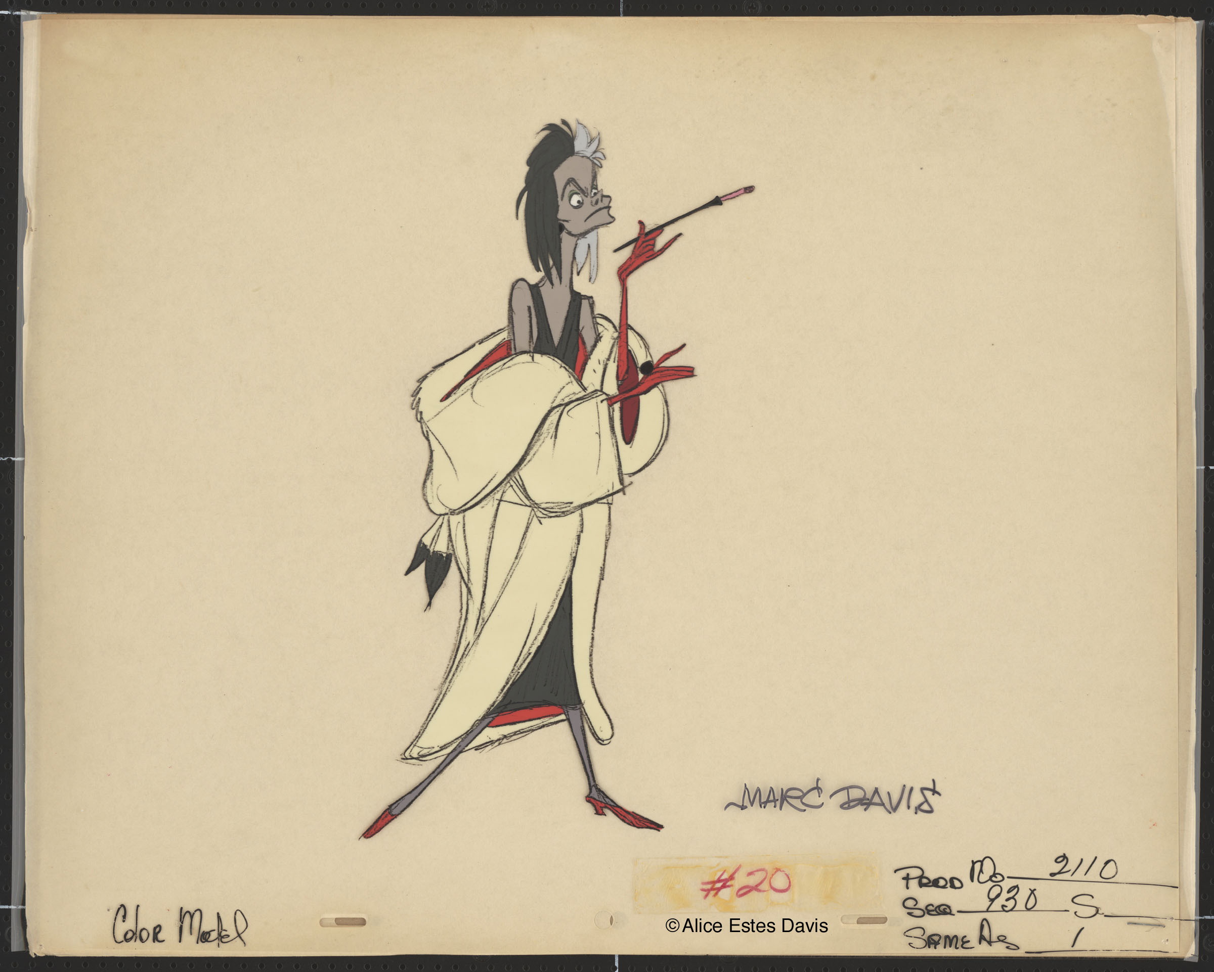 Due to the fact that “101 Dalmatians” used a new, innovative technology to strike the cells from the original artists’ renderings, Davis was in charge of animated the entire character for the film. Because of this, Davis did not need to create reference sheets of Cruella De Vil for other animators. However, he did a number of sketches and drawings for his own reference.