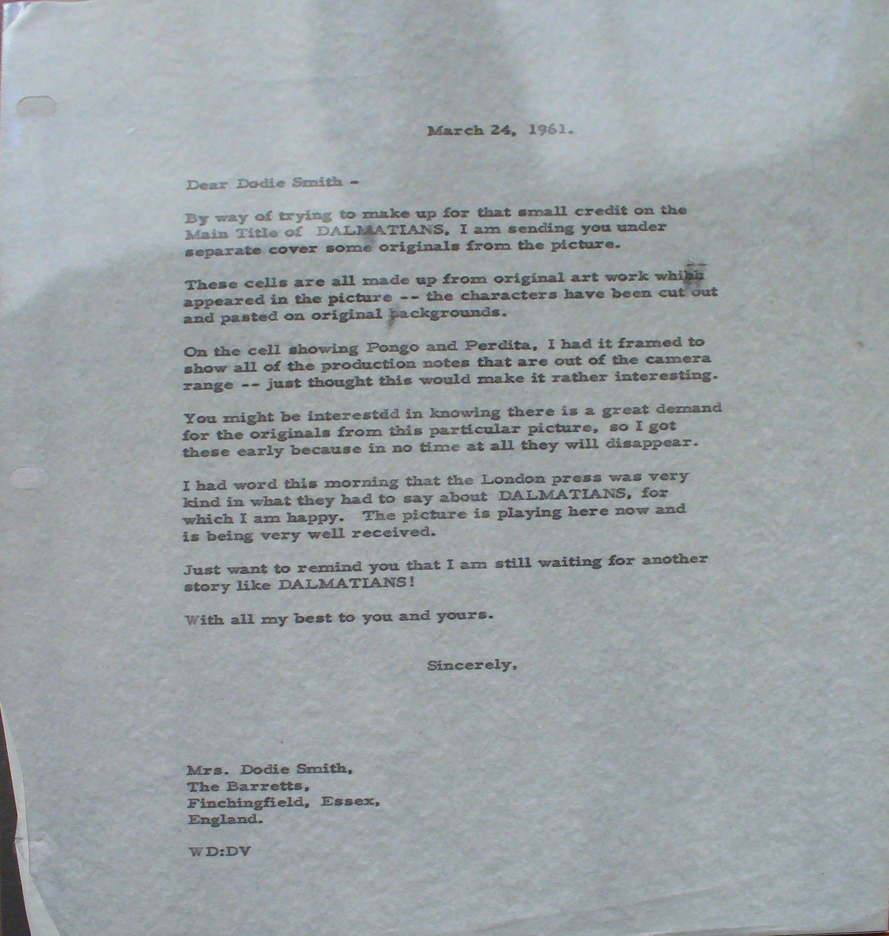 These letters are included in part on the 2-disc Platinum Edition DVD release of “101 Dalmatians.” Lisa Davis, who voiced the character of Anita in the film, reads the letters from Dodie Smith to Walt Disney on the DVD in the section entitled “Sincerely Yours, Walt Disney.”